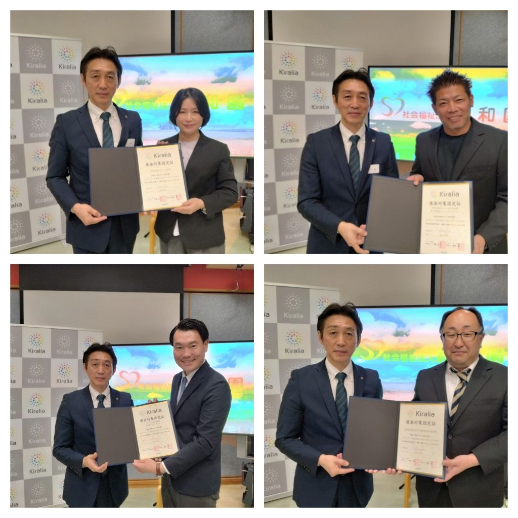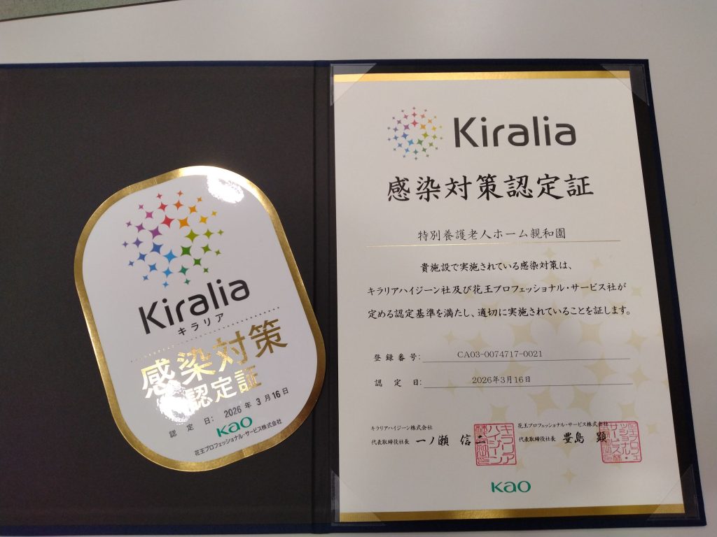 本日2026年4月1日、社会福祉法人親和園において、キラリアハイジーン株式会社及び花王プロフェッショナル・サービス株式会社が認定する「Kiralia(キラリア)感染対策認定」の証書授与式が執り行われました。