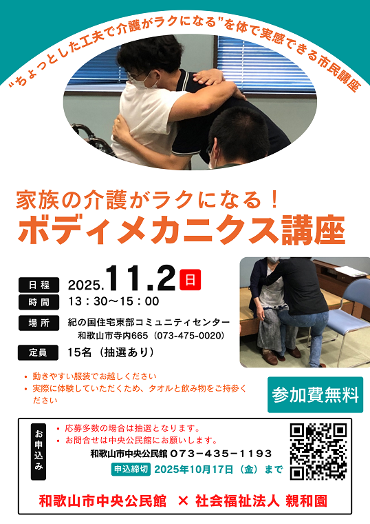 トップページNews家族の介護がラクになる!ボディメカニクス講座を開催します! 2025/10/09 法人本部 家族の介護がラクになる!ボディメカニクス講座を開催します! 和歌山市中央公民館と社会福祉法人親和園との共催で、家族の介護がラクになる!ボディメカニクス講座を開催します! 介護技術にご興味のある方はどなたでもご参加可能です。参加費無料! お申込みはこちらをタップ(LOGOフォーム) 和歌山市ホームページはこちらをタップ