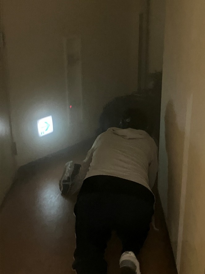 ◆火災発生時には煙が天井に向けて上昇することで、その煙を吸い込んでしまい一酸化炭素中毒となり死亡するケースがあるので、この煙避難体験では、四つん這いの状態で、片手で体のバランスを保ち、もう一方の手で口を覆いながら前進する体験学習訓練をしました。