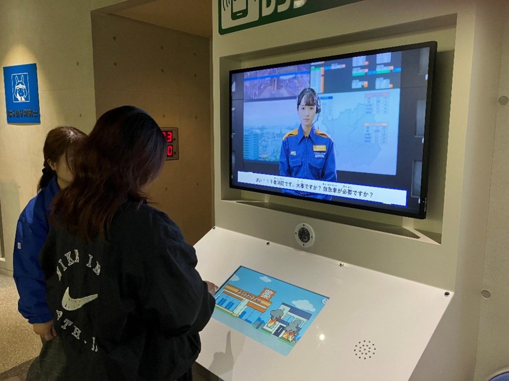 ◆レッツ・コール・119では、火災現場発見時に消防局指令センターにどれだけ的確な内容を通報できるかの体験学習訓練をしました。
